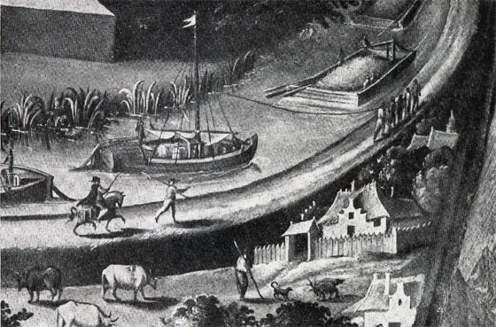 HOLOWANIE dubasa z lądu. Idący ścieżką flisowską czyli "trelem" flisacy, holują pod wodę dubas na podciągniętej do pół masztu "pólce" czyli "trylu", prawdopodobnie w rejonie "Przerabki" obok Gęsiej Karczmy nad Martwą Wisłą. Z prawej u góry schodząca z wodą załadowana zbożem komięga. Dubas pod ładunkiem zakupionym w Gdańsku. W części dziobowej widoczne beczki – być może ze śledziami. U podstawy masztu reja z gotowym do postawienia przy sprzyjającym wietrze żaglem. (Fragment "Alegorii Handlu Gdańskiego" Izaaka van dem Blocke´a).