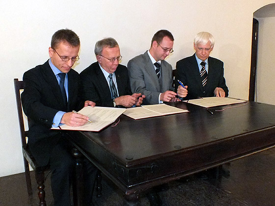 Od lewej: Michał Wilkowski - Prezes Zarządu MEW S.A., Leszek Karwowski - Prezes KZGW, Zbigniew Siedlarz i Mieczysław Janusz Jagła - Stowarzyszenie Miłośników Ziemi Niepołomickiej