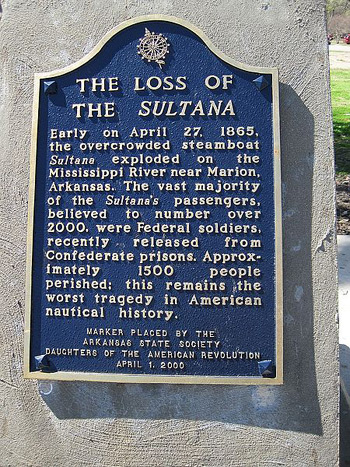 Pod koniec wojny secesyjnej (American Civil War) w USA w dniu 27 kwietnia 1865 r. eksplodował i zatonął w rzece Missisipi w pobliżu Memphis (Tennessee) parostatek "Sultana", co było największą katastrofą w historii żeglugi w USA. Około 1.700 osób (według innych źródeł nawet ponad 1.800), głównie uwolnionych z niewoli konfederatów żołnierzy Unii, straciło życie w mroźną noc wiosenną, gdy kotły na pokładzie przeładowanego parowca eksplodowały. Pomimo, iż zbawczy brzeg był tak blisko - wycieńczeni żołnierze, którzy przeżyli eksplozję nie mieli siły aby doń dopłynąć...