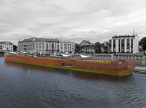 Wiadomo już, komu przeszkadzał "Stefan Batory". Nowa barka, która za rok zacumuje na Wiśle, ma reklamować szklane elewacje budynków, w których rosną kwiaty, owoce, warzywa. Będzie długa, pokryta trawą, a w środku znajdzie się nie restauracja, lecz siedziba firmy Kontrapunkt i punkt wystawienniczy. Inwestycja ma kosztować ok. 6 mln zł.