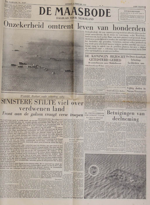"W wielu miejscach na zachodzie kraju powstał stan zagrożenia z powodu niezwykle wysokiego poziomu wody. Meldunki o zaistniałej sytuacji dotarły do nas, jak dotąd, z miejscowości na wybrzeżu oraz Holandii Południowej i Wysp Zelandzkich. Pierwsza wiadomość nadeszła dzisiejszej nocy między godziną czwarta i czwartą trzydzieści ze Zwindrechtu, gdzie ogłoszono stan wyjątkowy. Woda zaatakowała tamy. Według doniesień sytuacja jest krytyczna".