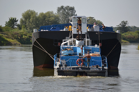 Gabriela Tomik z pokładu zestawu pchanego "Dommil" lustruje najbardziej zniszczony odcinek Odry poniżej Brzegu Dolnego