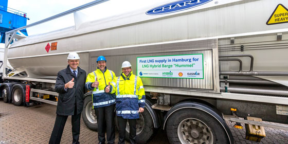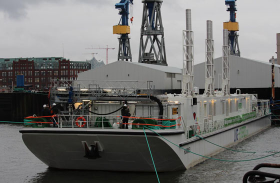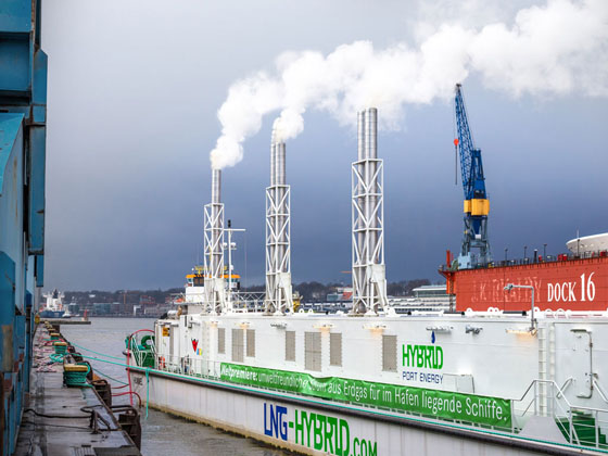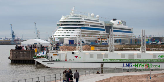 Nowość na miarę światową – hybrydowa barka “Hummel” (trzmiel) wyposażona w generatory prądotwórcze napędzane przez silniki zasilane skroplonym gazem ziemnym weszła oficjalnie do eksploatacji w porcie w Hamburgu. Tym samym Hamburg stał się pierwszym portem w Europie który zapewnia zewnętrzne, czyste ekologicznie zasilanie prądem oceanicznych wycieczkowców. Ostateczna, generalna próba odbyła się po podłączeniu ‘Hummla” do stojącej przy nabrzeżu “AIDYsol” 29 maja 2015. Przekazanie energii elektrycznej z barki na statek odbyło się bez najmniejszych problemów.