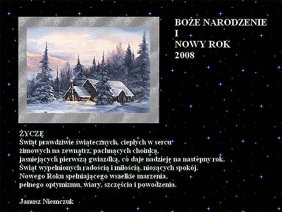 Wesołych świąt! Bez zmartwień, Z rodziną, Z gościem co niesie szczęście, Z barszczem, z grzybami, z karpiem! W święta, niech się snuje kolęda. I gałązka świerkowa niechaj pachnie na zdrowie! Wesołych świąt no i oczywiście szczęśliwego Nowego , 2008 roku!!! Czego Tobie Andrzeju życzę!