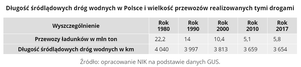 Podczas, gdy w krajach Unii Europejskiej rośnie rola przewozów wodnym transportem śródlądowym, w Polsce tendencja jest odwrotna. Wpływ na to ma m.in. zmniejszająca się długość śródlądowych dróg wodnych i wieloletnie zaniedbania inwestycyjne na nich.