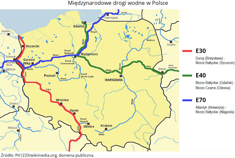 - E-70 - łączący Holandię z Rosją i Litwą, a na terenie Polski obejmujący Odrę od ujścia kanału Odra-Hawela do ujścia Warty w Kostrzynie, drogę wodną Wisła - Odra oraz od Bydgoszczy dolną Wisłę i Szkarpawę lub Wisłę Gdańską.