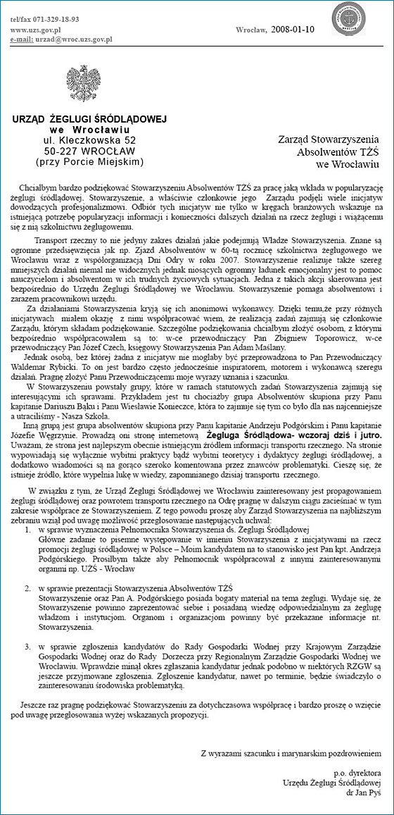 Kilka dni temu do Zarządu Stowarzyszenia Absolwentów Zespołu Szkół Zawodowych Żeglugi Śródlądowej (Stowarzyszenia TŻŚ) wpłynął drogą elektroniczną (e-mail) list od dyrektora Urzędu Żeglugi Śródlądowej we Wrocławiu - dr Jana Pysia, który w całości chcę Wam zaprezentować jako skan dokumentu wystosowanego oficjalnie.