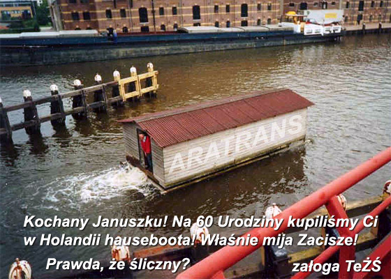 Kochany Januszu! W Dniu uzyskynia "męskiej pełnoletnści" składamy Ci najlepsze życzenia - Skipper." "Chociaż chodziliśmy do jednej szkoły to poznałem Cię dopiero dzięki tej stronie internetowej. W tak krótkim czasie zaprzyjaźniliśmy się i utrzymujemy do dzisiaj towarzyskie kontakty. Mimo, że nie jesteś w zawodzie, który zdobyliśmy przy Brücknera 10 to Twoja wiedza i zaangażowanie w nasz szczytny cel lobbowania polskiej żeglugi śródlądowej zalicza Cię do grona najlepszych "synów TŻŚ-iu".