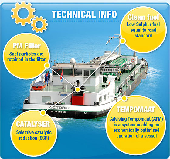 Jako "najczystszy statek" służy holenderski zbiornikowiec "Victoria". Jest on bowiem eksploatowany według aktualnie najnowszych technologii, przy których osiągane są optymalne wyniki transportowe, a emisje szkodliwych czynników w jak największym stopniu redukowane. Jako podstawowy warunek do zminimalizowania przedostawania się do wydechu tych substancji służy wolny od siarki olej napędowy EN 590, którym napędzany jest silnik MTU typoszeregu 4000. Tylko takie paliwo zapobiega wydostawaniu się trujących tlenków siarki do atmosfery.