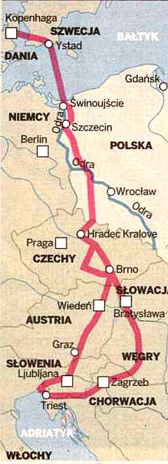 Tymczasem Niemcy starają się wypromować inny sposób przewozu towarów z Bałtyku nad Adriatyk. Trwają ich starania o uruchomienie projektu SCANDR1A, który zakłada rozwój szlaków komunikacyjnych - drogowych i kolejowych - od Skandynawii do Adriatyku przez ich terytorium. W rywalizacji między Polską a Niemcami chodzi o to, które pony bałtyckie będą miały lepsze połączenia z tymi nad Adriatykiem. Może ją wygrać ten, któremu szybciej uda się zdobyć unijne pieniądze na te projekty. Wniosek o wsparcie SCANDRII ma być wkrótce rozpatrywany przez Ko-misję Europejską.