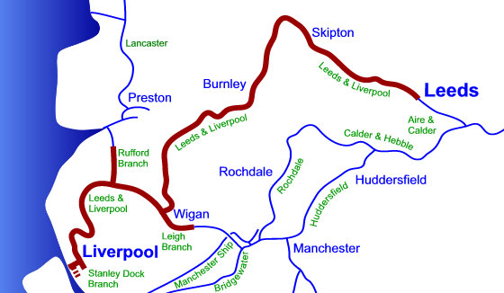 Leeds-Liverpool jest najdłuższym kanałem w północnej Anglii - ma 127 mil (ponad 200 km) długości. Prowadzi przez 91 śluz pokonując róznice poziomów 487 stóp (146 m). W Leeds łaczy się z Aire & Calder Navigation. Odgałęzienie Rufford Branch łączy kanał z Ribble w pobliżu ujścia Preston, dając dostęp do Ribble Link i Kanału Lancaster. Odgałęzienie Leigh Branch prowadzi do Wigan, by połączyć się następnie z Kanałem Bridgewater. W samym Liverpoolu rozszerzenie Liverpool Link zostało zbudowane ze Stanley Dock Branch poprzez Pier Head do Albert Dock. Część trasy przebiega w tunelach.