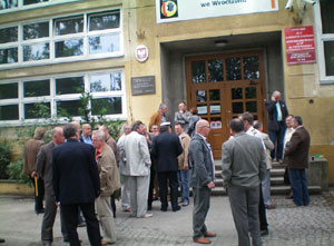 Po chwili podchodzi do nas inny przystojny wysoki mężczyzna. Również jego nie spotkałem osobiście do tej pory, ale znamy się z internetu. Tadeusz Wydrych kończył Szkołę w 1964 roku kiedy ja nie miałem jeszcze pojęcia, że we Wrocławiu jest ul. Brücknera. Witamy się bardzo serdecznie. Jego ciepły uścisk dłoni mówi sam za siebie. To jeden z Przyjaciół, których poznałem dzięki Szkole przed którą w tej chwili stoimy.