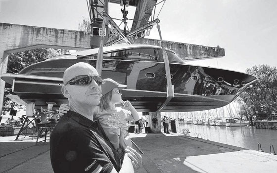 Andreas Grieger z córeczką Isabel podczas wodowania jachtu w basenie stoczni Bodan Werft w Kressbronn