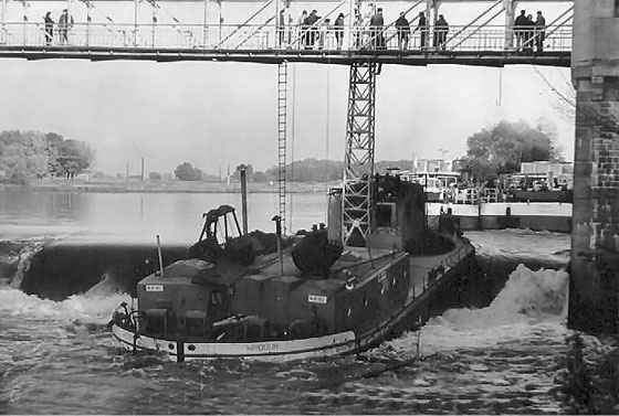 Właściciel barki podjął decyzję wyładowania kruszywa do rzeki przy pomocy ładowarki samojezdnej przemieszczonej na pokład jednostki z mostu za pomocą dźwigu samochodowego. Była to jedyna udana operacja, kruszywo zostało po prostu zrzucone do wody na klapę jazu. Barka po wyładunku spłynęła z jazu na dolne stanowisko. I w tym momencie przyszła armatorowi genialna myśl aby przeprawić barkę z powrotem na górne stanowisko jazu przez opuszczoną klapę. Zaangażował dla tej operacji pchacza Byk 4 na dolnym stanowisku i samochód ciężarowy na lądzie w górnym stanowisku z wyciągarką, tzw. lebiodką.