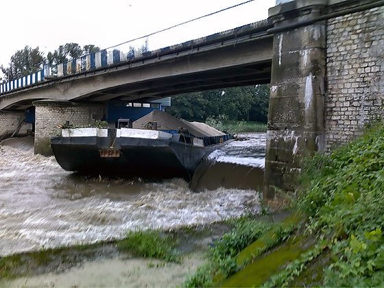 Kraków, Koźle (inf. własna). Wczoraj w godzinach rannych między godziną 6 a 7 na jazie klapowym Koźle ( km 0,96 Nowej Odry) miało miejsce bardzo poważne zdarzenie żeglugowe, lub jeśli ktoś woli inną formę - wypadek żeglugowy.