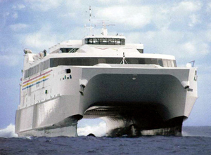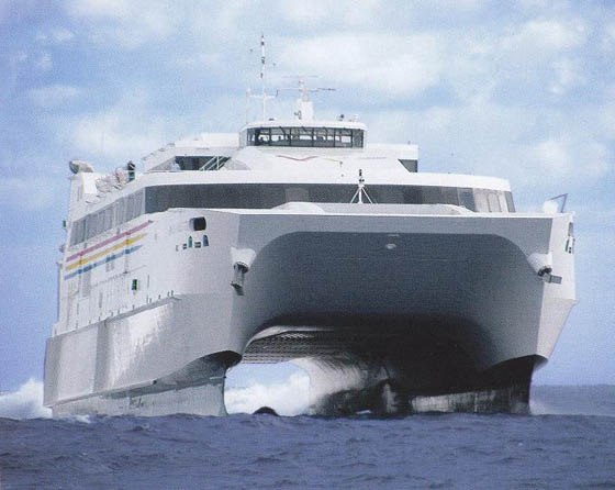 Ten ogromny katamaran napędzany jest przez cztery silniki MTU największego typoszeregu, "8000" o łącznej mocy 36 400 KW czyli prawie 50 000 KM! Przekazują one swoją moc poprzez Przekładnie ZF (Zahnradfabrik, również z Friedrichshafem!) na cztery pędniki strugowodne Rolls - Royce KaMeWa. Prędkość podróżna katamarana - 39 węzłów. Nieźle. Statek wyposażony jest w stabilizatory przechyłów Austal Ride Control, które zapewniają maksymalny komfort pasażerów jeżeli Morze Śródziemne się gniewa.