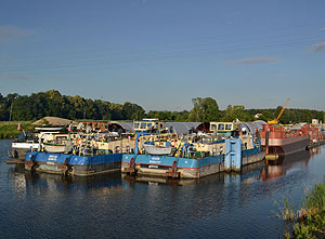 Jak widzieliśmy na zdjęciach do newsa o popiersiu Kwiatkowskiego - w Brzegu dolnym zgromadziły się w oczekiwaniu na "falę" jednostki transportujące do Szczecina ładunki ponadgabarytowe. W długi weekend ruszyły w dół Odry. Wśród nich znalazł się także kadłub barki pchanej ze stoczni "Malbo" we Wrocławiu prowadzony przez dwa pchacze "Dommil", których armatorem jest kpt. Czesław Szarek.